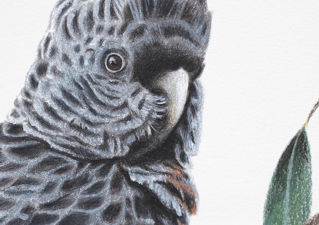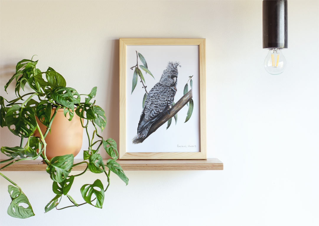 This fine art print features a female Gang-gang Cockatoo sitting in a eucalyptus tree, with leaves in the background.