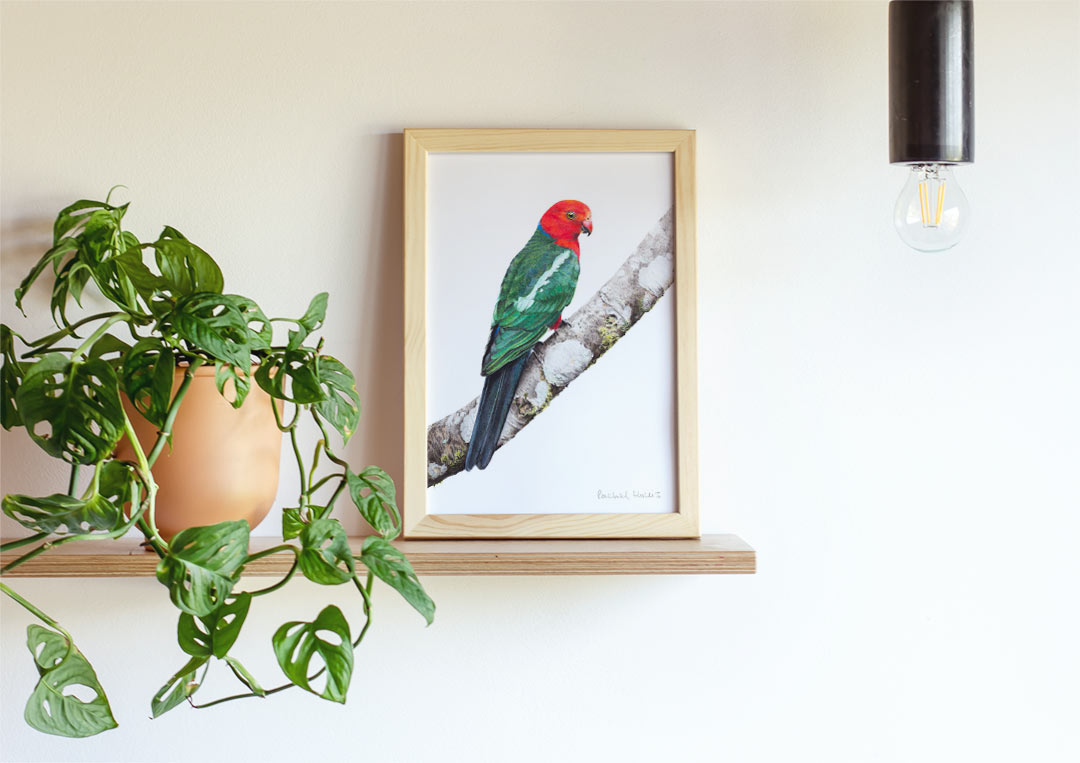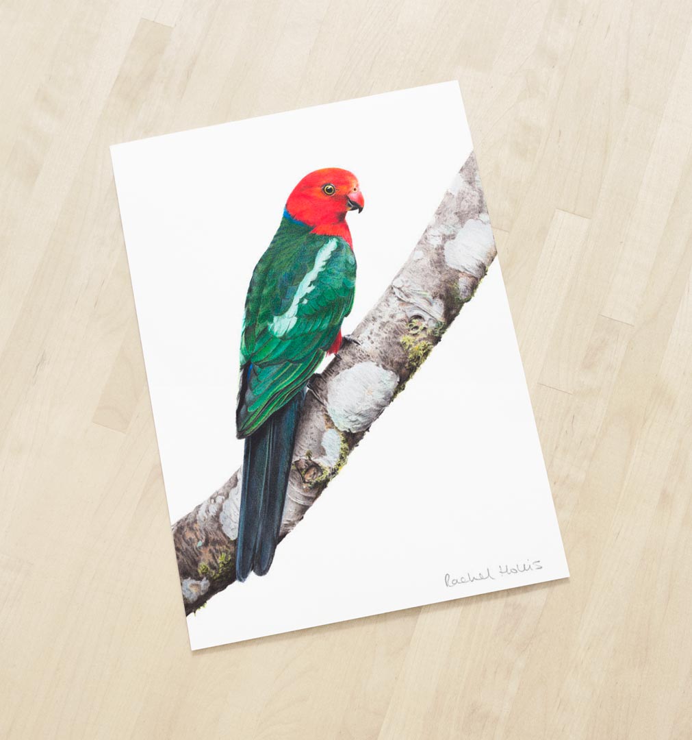 This fine art print features an Australian King Parrot sitting on a branch covered in lichen.