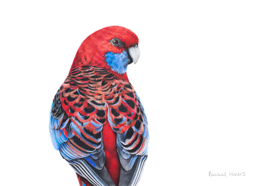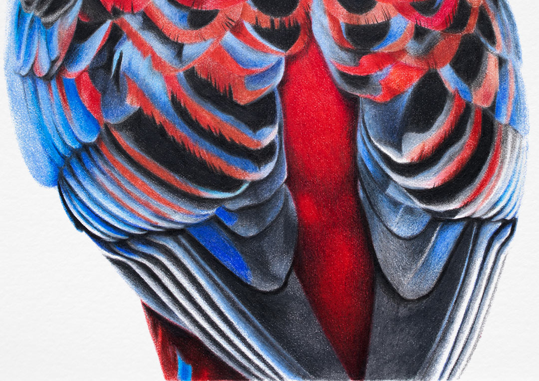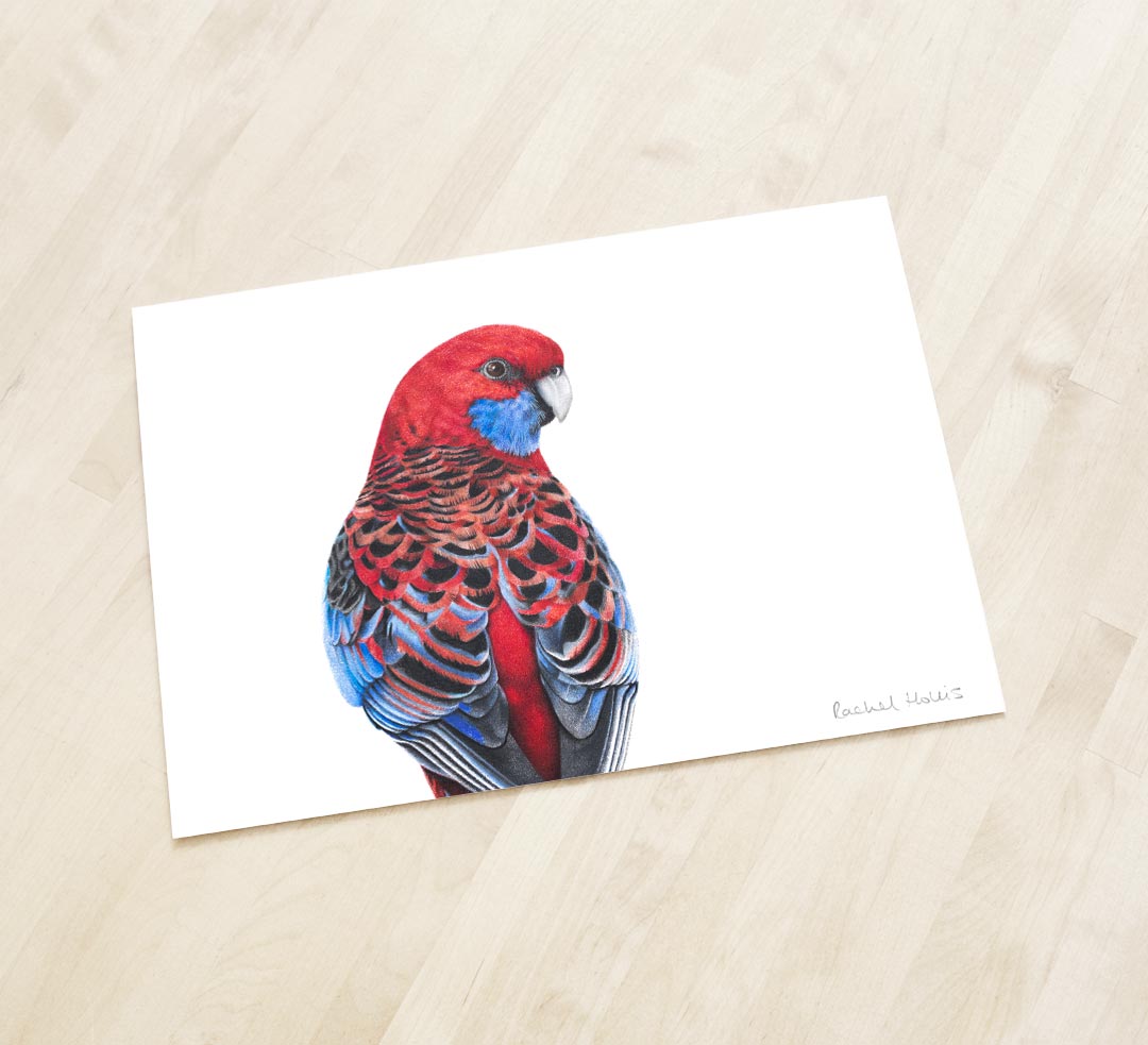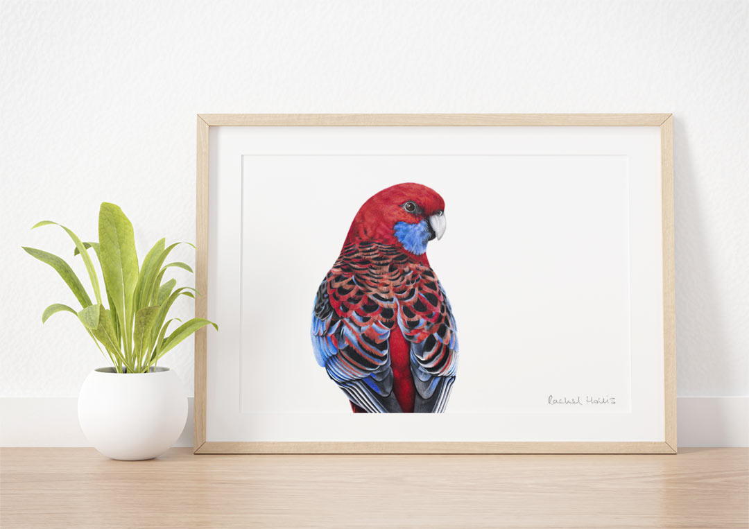 This fine art print features the beautiful feathers of a Crimson Rosella.Crimson Rosellas (Platycercus elegans) are native to the east and south-east of Australia and are found in coastal and mountain forests. They are often seen in pairs and stand out in the forest due to the incredible mix of red and blue feathers.