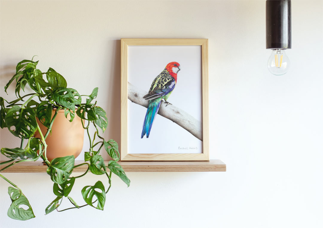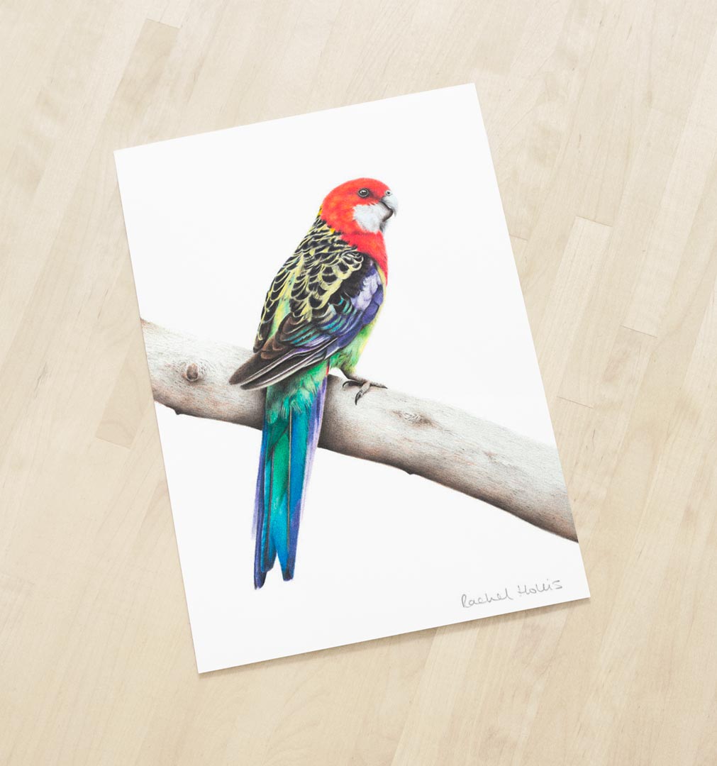 This fine art print features an Eastern Rosella on the branch of a eucalyptus tree.