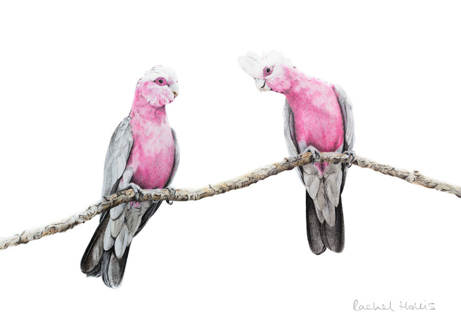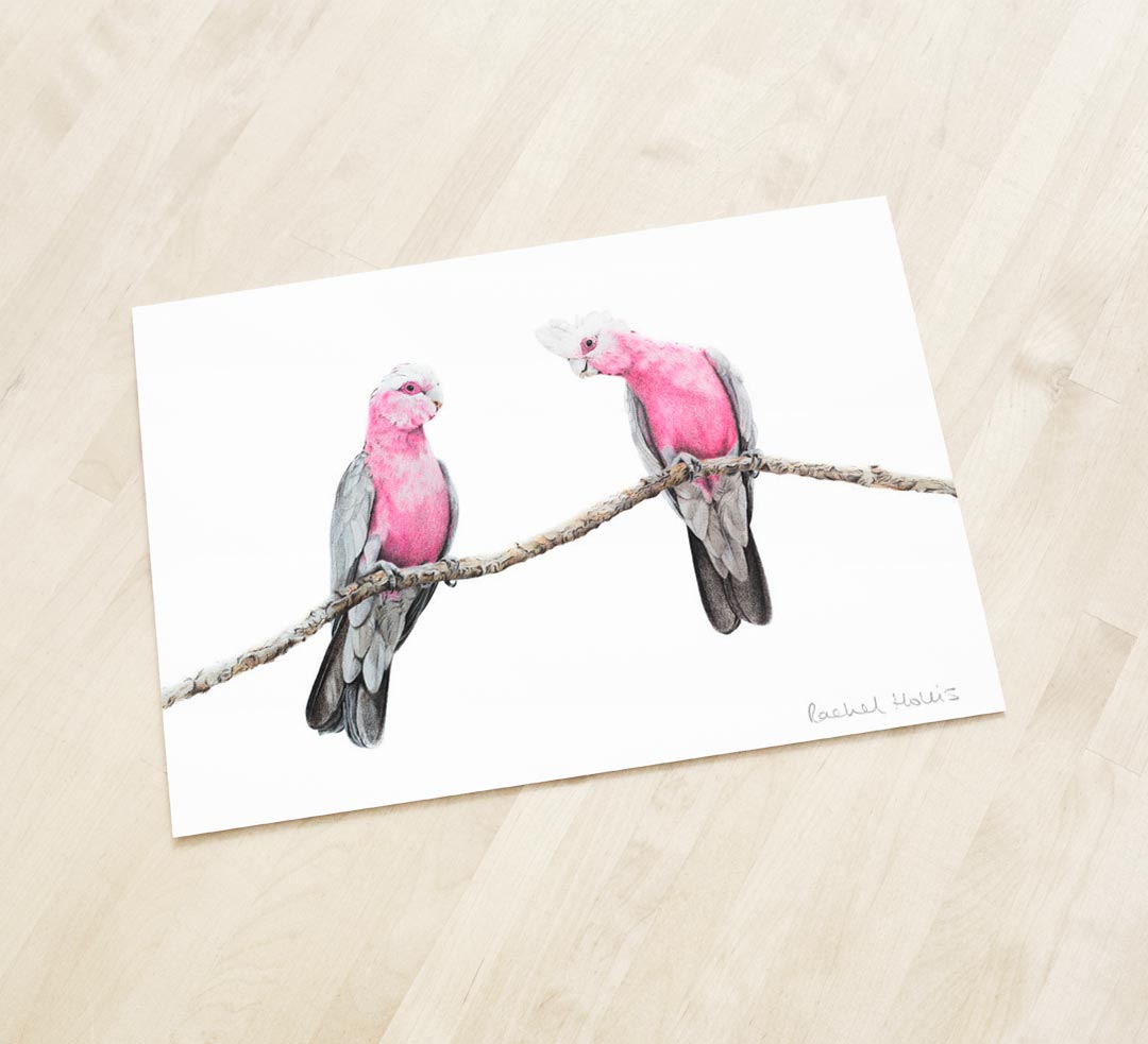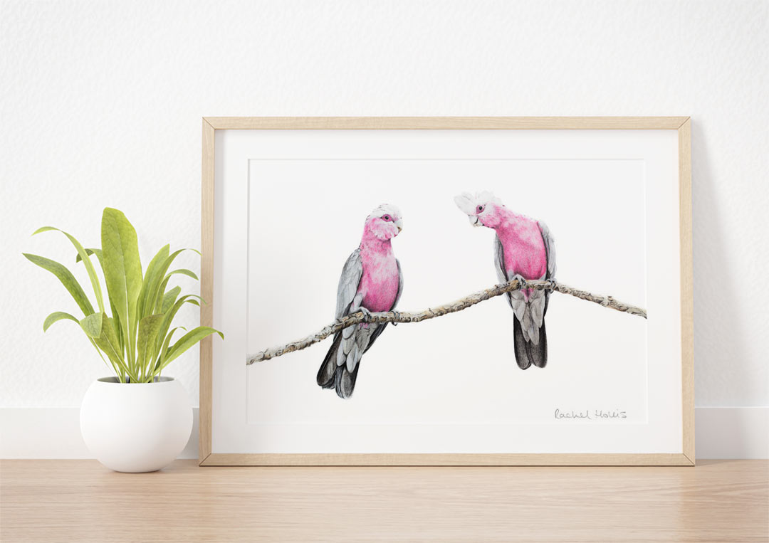 This fine art print features a pair of Galahs interacting on a branch, one has its crest up.