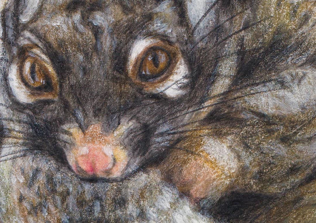 This fine art print features a Green Ringtail Possum curled up in a ball while resting.