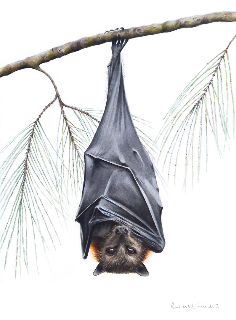 Original drawing of a Grey-headed Flying Fox roosting in a Casuarina tree.