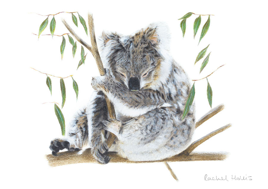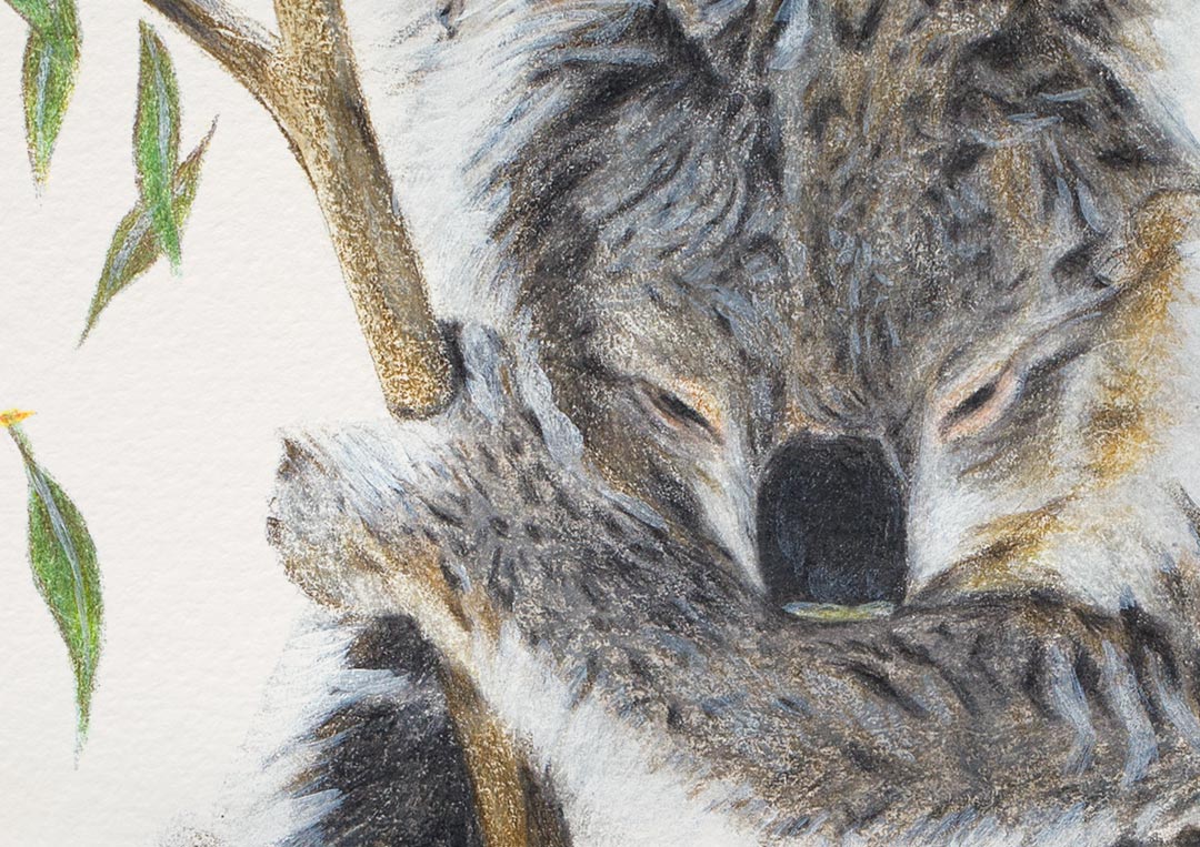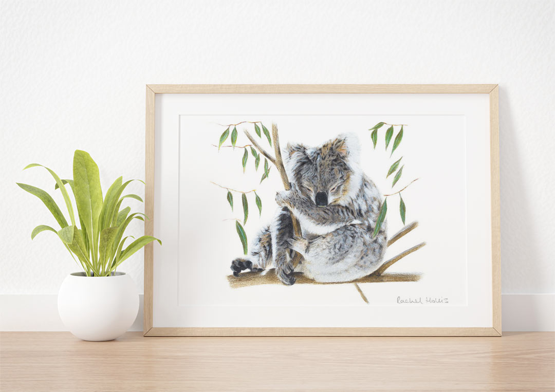 This fine art print features a sleepy Koala holding onto a branch in a eucalyptus tree, with gum leaves on the left and right.