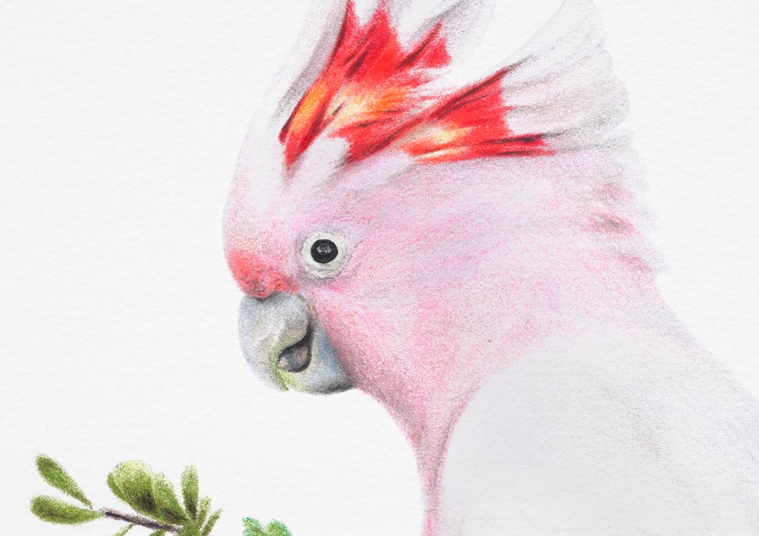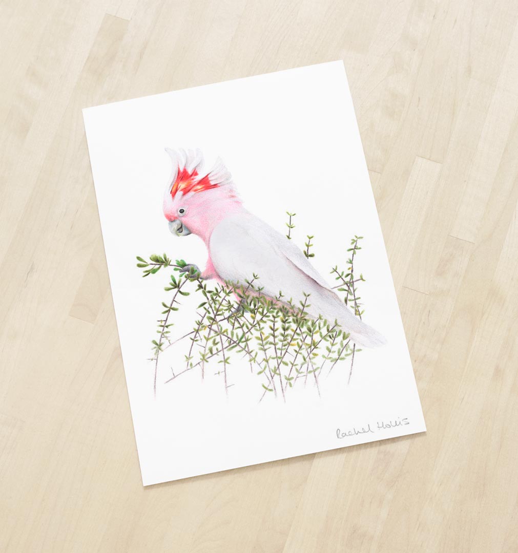 This fine art print features a Pink Cockatoo perched in the foliage of a native shrub.
