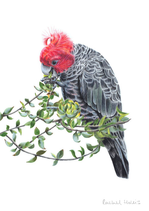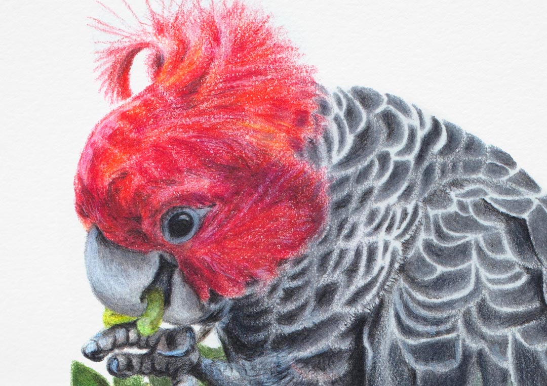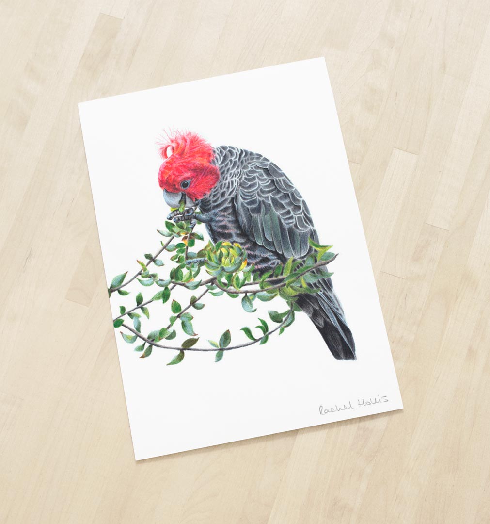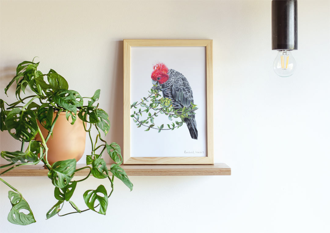 This fine art print features a male Gang-gang Cockatoo feeding in a native Australian shrub.