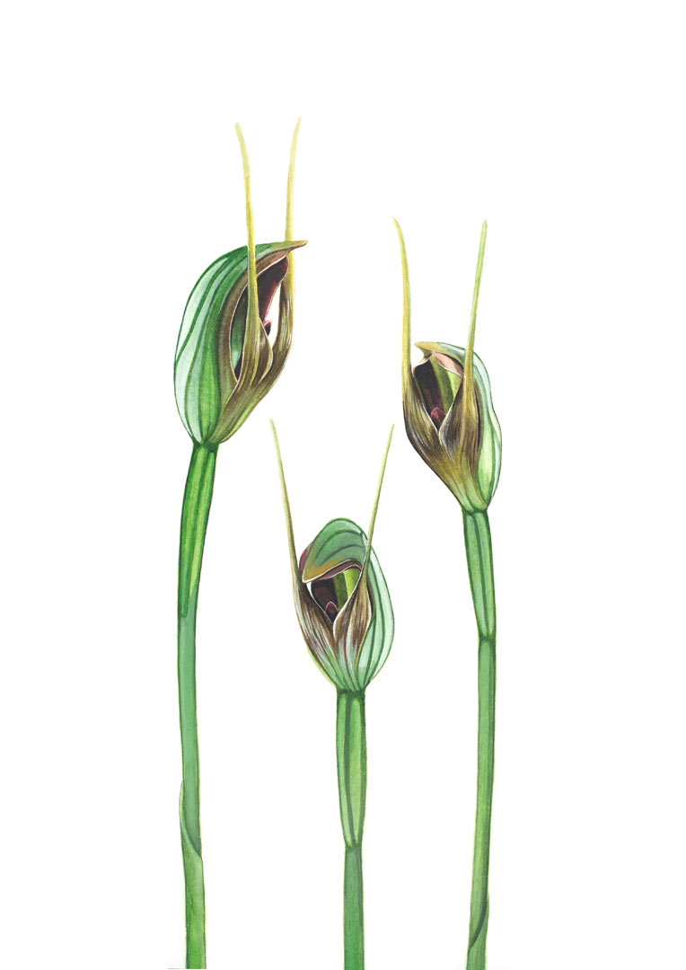 Upright Maroonhoods (Pterostylis pedunculata) are a species of orchid endemic to south-eastern Australia. The green flowers are an unusual white near the base and as their names suggests look like little hoods.