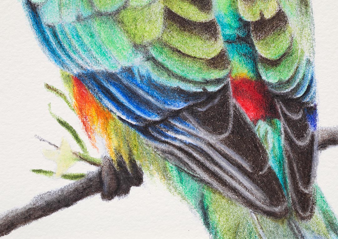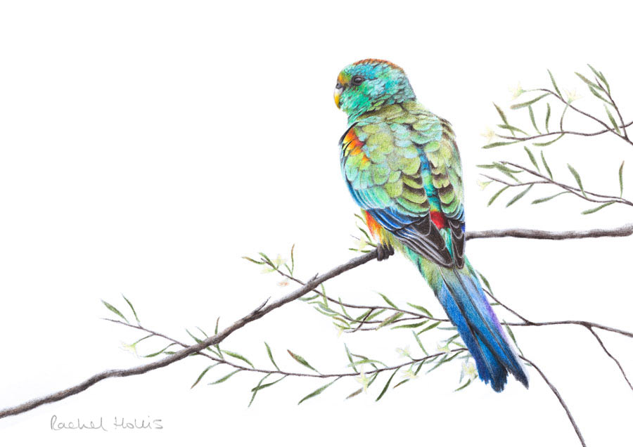 Mulga Parrots (Psephotus varius) are also known as Many-colored Parrots and are one of Australia’s beautiful endemic birds. This drawing is of an immature male that is exhibiting colours found on both the male and female birds.