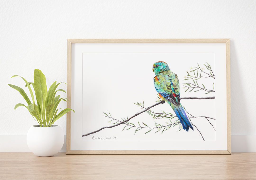 This fine art print features an immature male Mulga Parrot in a native Australian shrub with tiny yellow flowers.