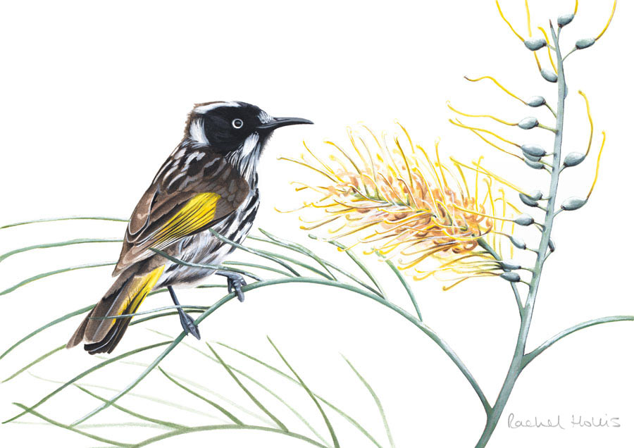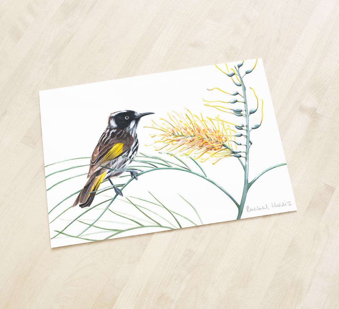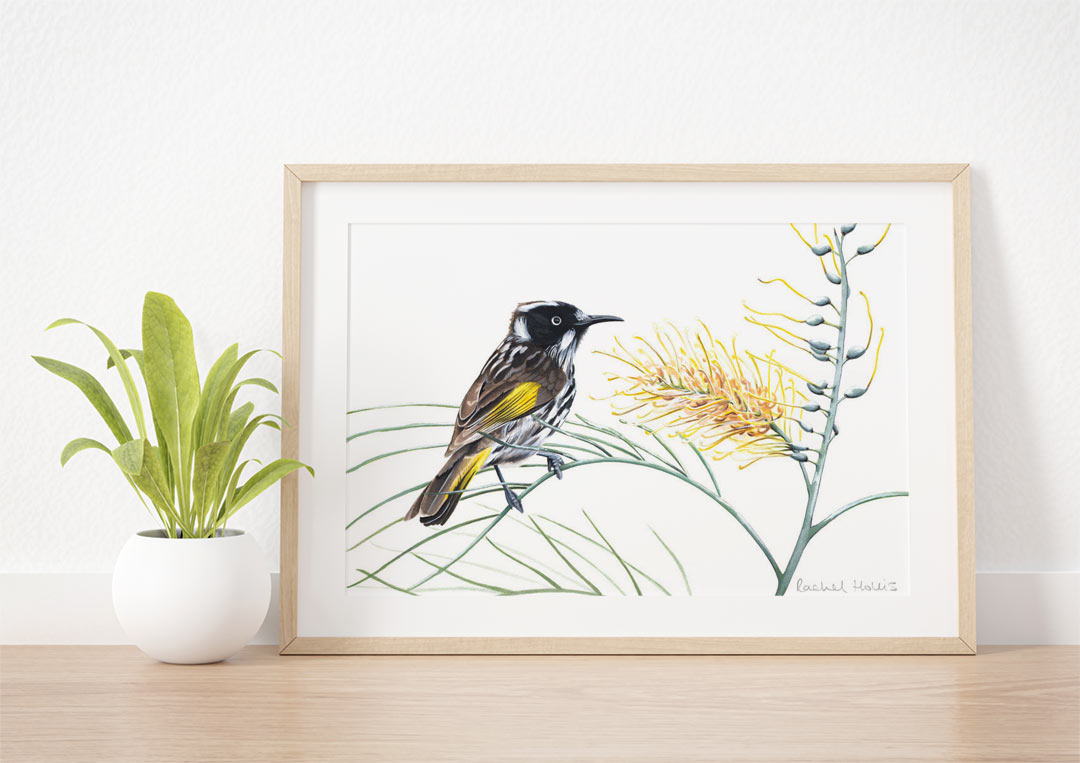 This fine art print features a New Holland Honeyeater on a native Australian Grevillea flower and foliage.