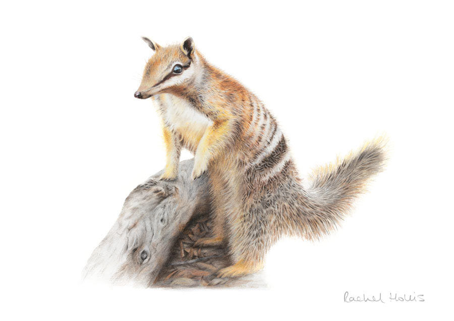 Numbats (Myrmecobius fasciatus) are small marsupials native to Western Australia and were once widespread across much of the country. They are currently listed as endangered on the IUCN Redlist with the number of adults in the wild at approximately 800 and declining. They feed mostly on termites so can be seen foraging around rotten logs and tree roots on the forest floor.