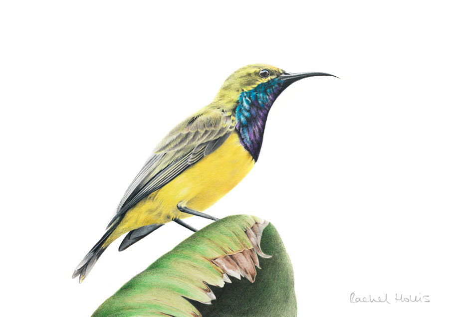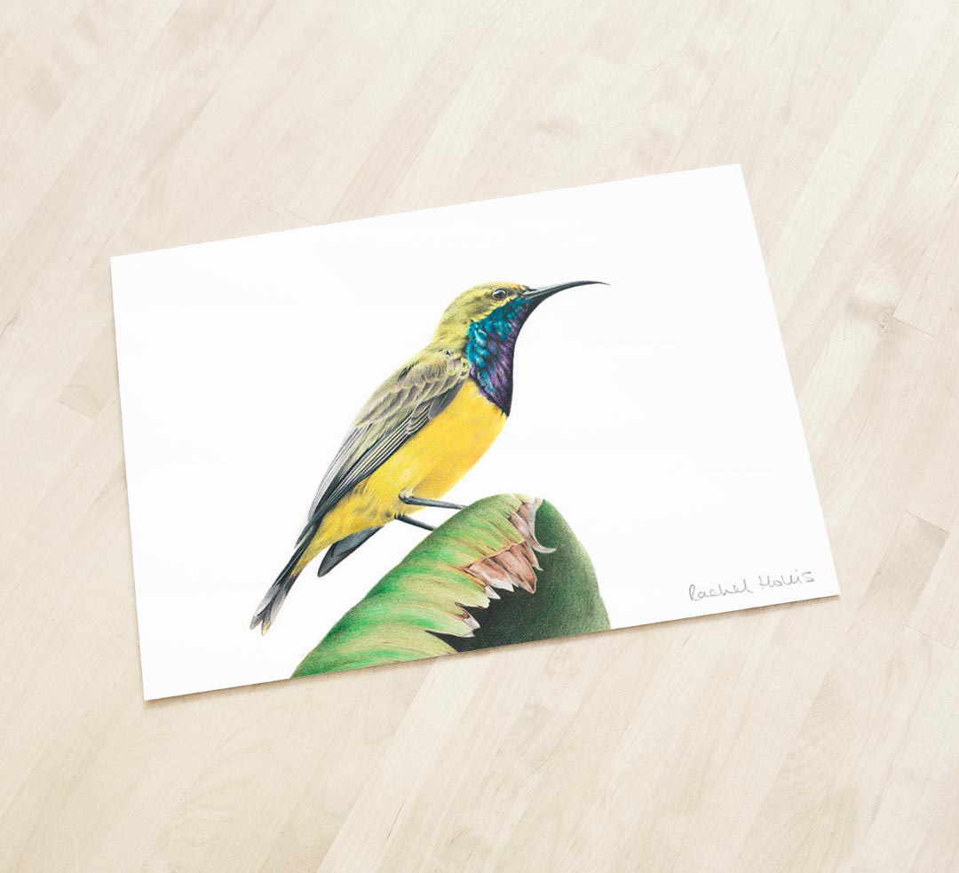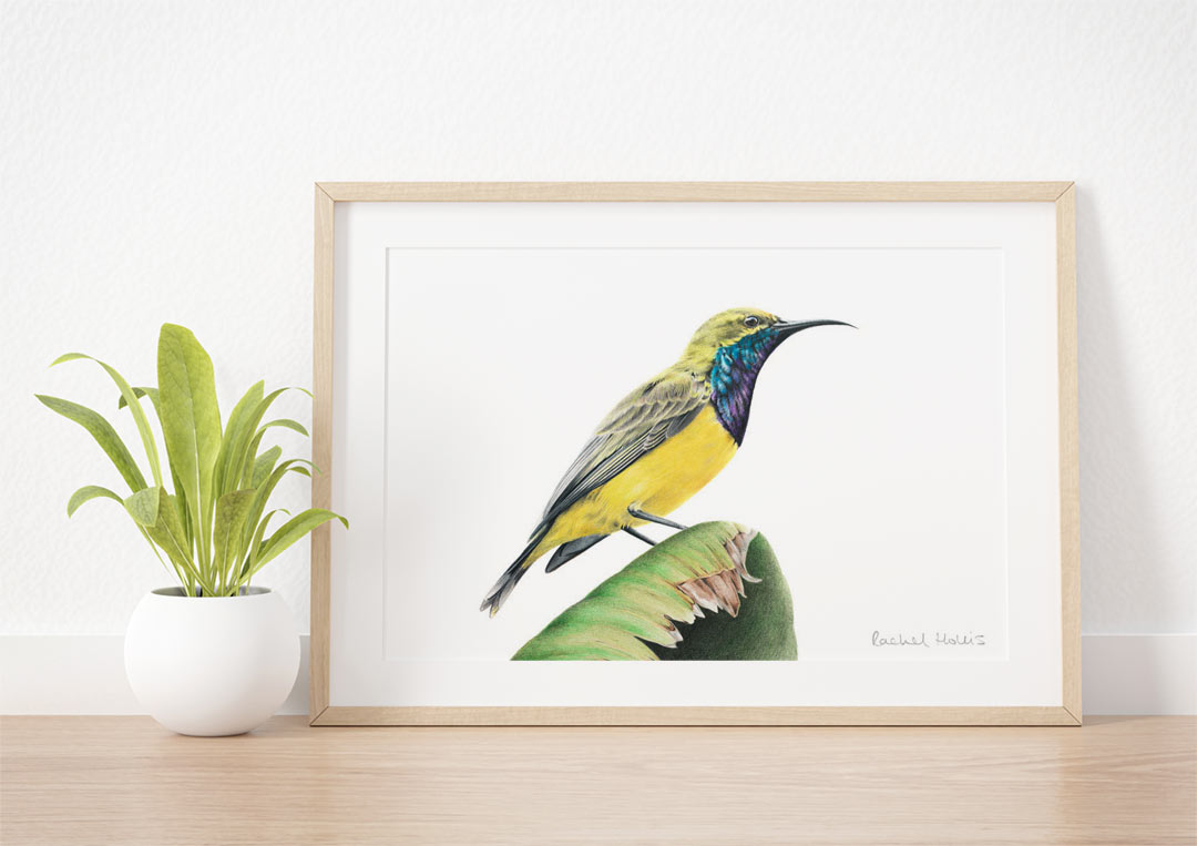 This fine art print features an Olive-backed Sunbird perched on the tip of a palm frond.