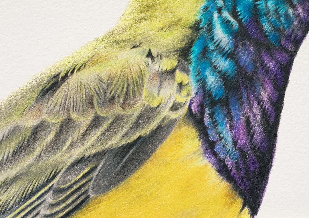 Olive-backed Sunbirds (Cinnyris jugularis), also known as Yellow-bellied Sunbirds are found throughout much of northern Queensland, especially in coastal areas. They are tiny birds that build a hanging nest and the males have striking blue and violet iridescence on their throat and chest.