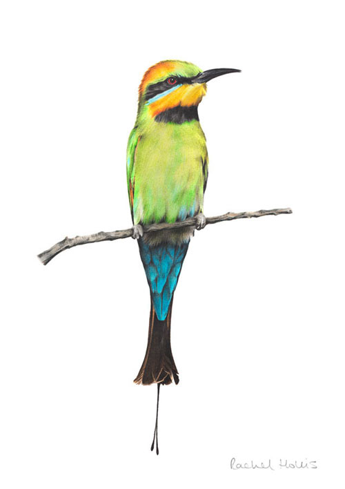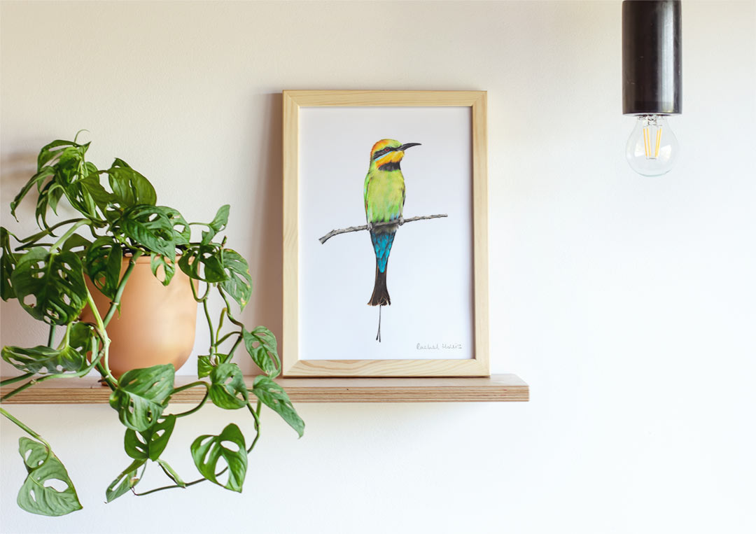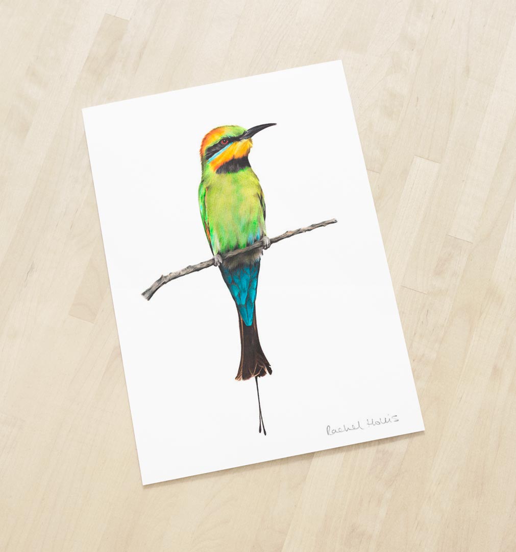 This fine art print features a Rainbow Bee-eater perched on a small branch.