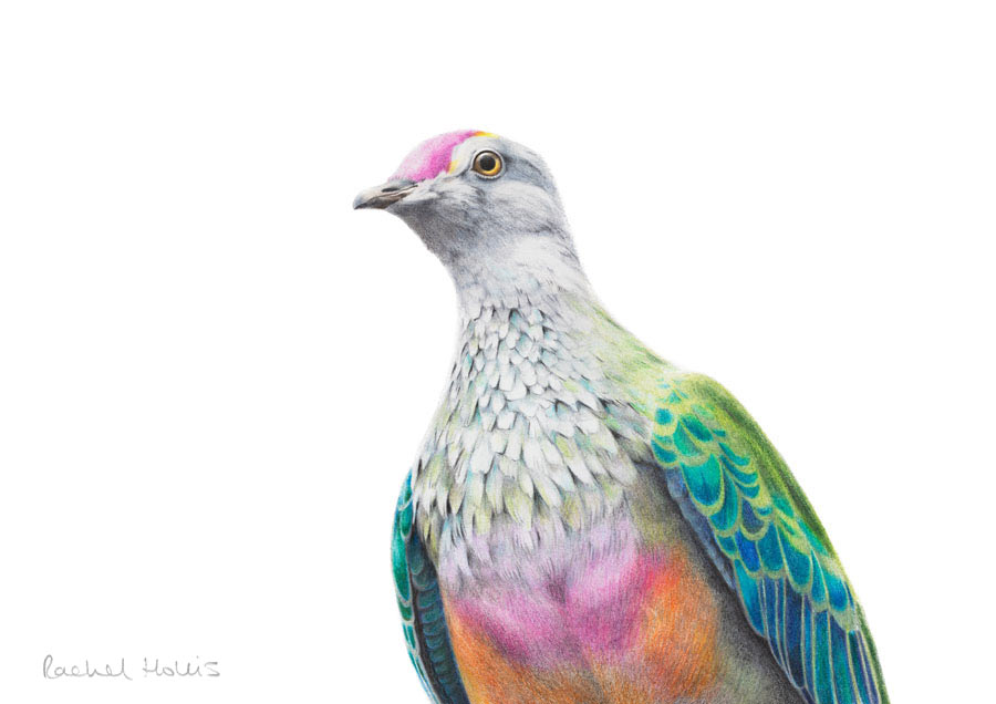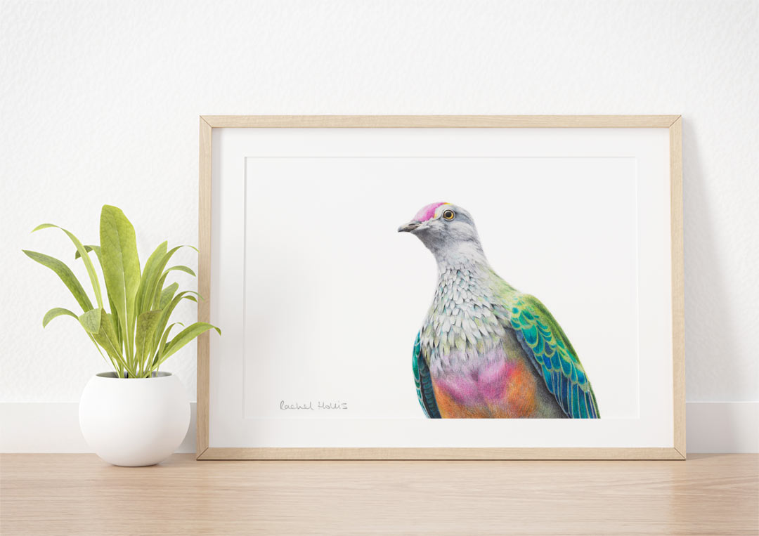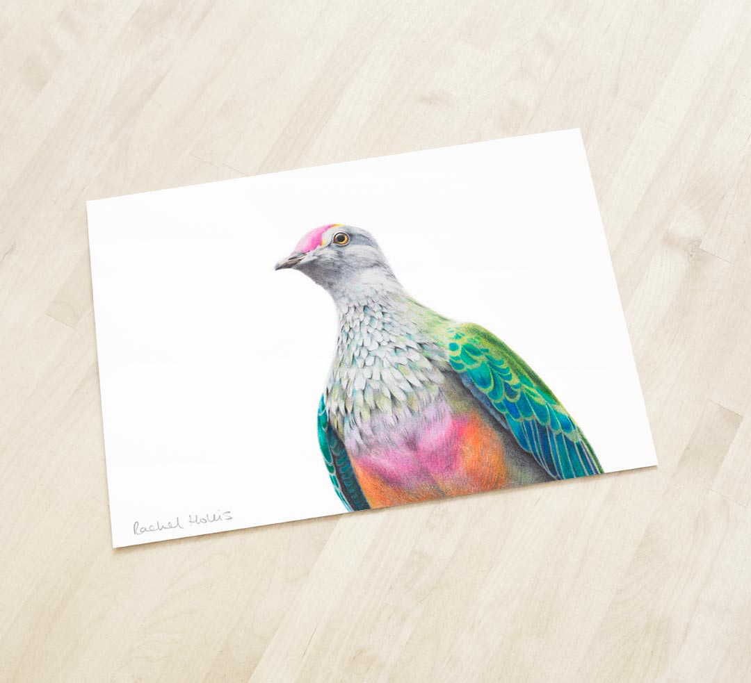 This fine art print features a Rose-crowned Fruit Dove.