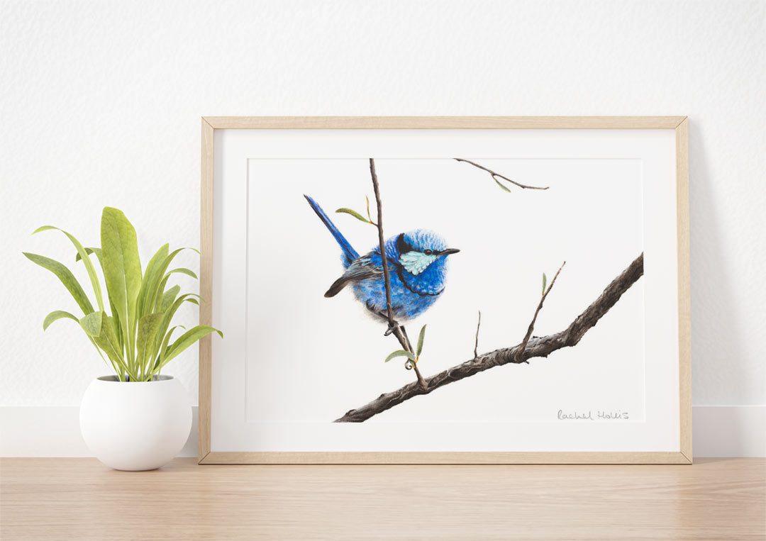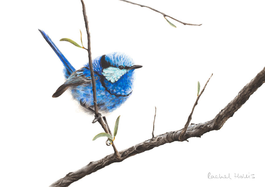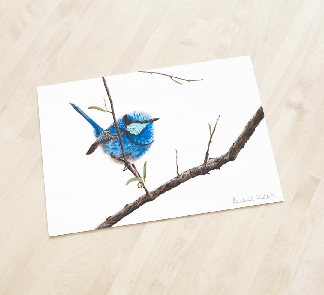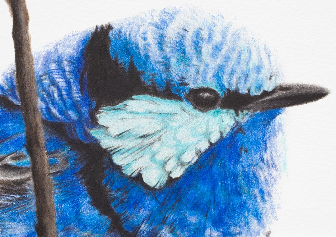 This is a fine art print of my drawing of a Splendid Fairywren perched on a small branch.