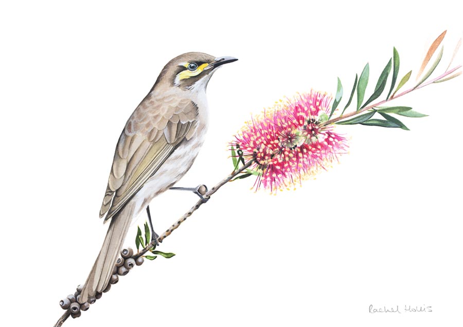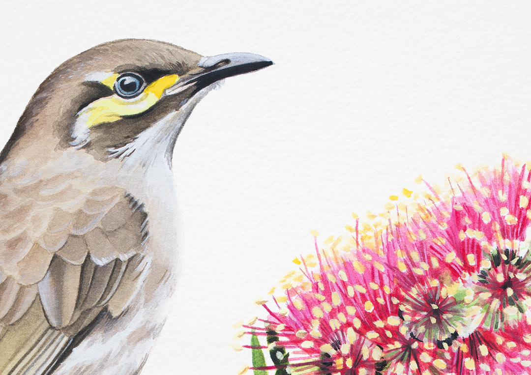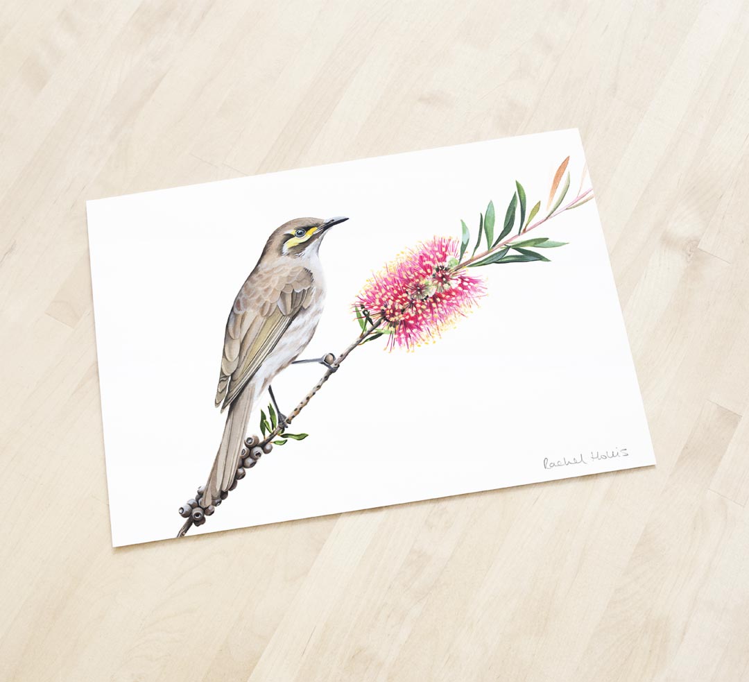 This fine art print features a Yellow-faced Honeyeater on a native Australian bottlebrush (Calistomen) flower and foliage.